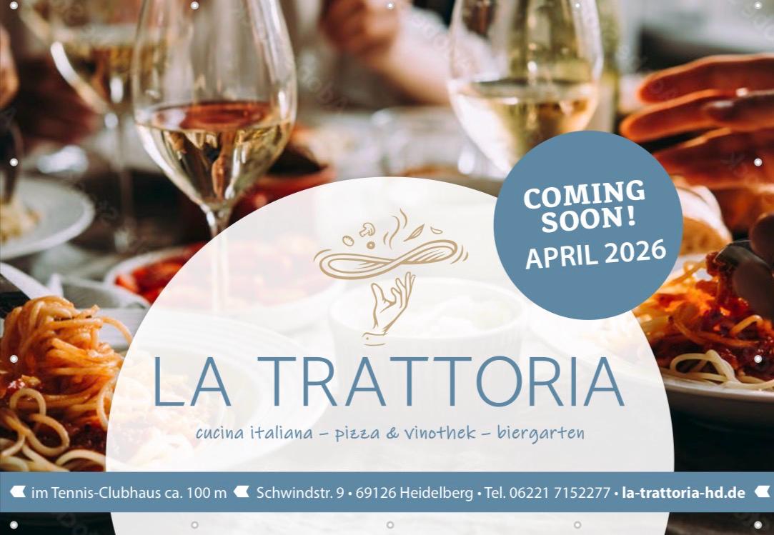 Im April 2026 eröffnet die „La Trattoria“ im Tennisclub ihre Türen. Freut euch auf authentische italienische Küche, erlesene Weine, ein liebevoll neu gestaltetes Restaurant mit gemütlichem Biergarten und herzliche Gastfreundschaft.